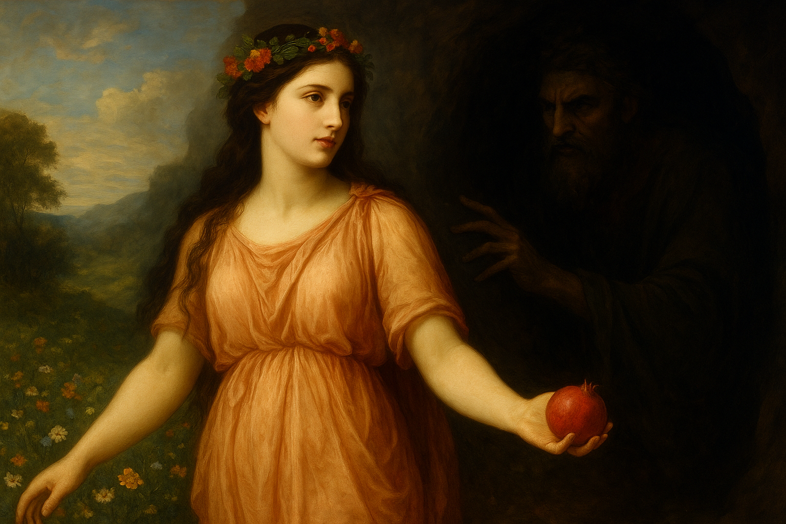 Одного разу, коли Персефона збирала квіти в долині Ніси, земля розійшлася, і з неї з’явився Аїд, володар підземного світу. Він схопив дівчину та забрав до свого царства, зробивши її своєю дружиною. Це викрадення було дозволене Зевсом, але приховане від Деметри.